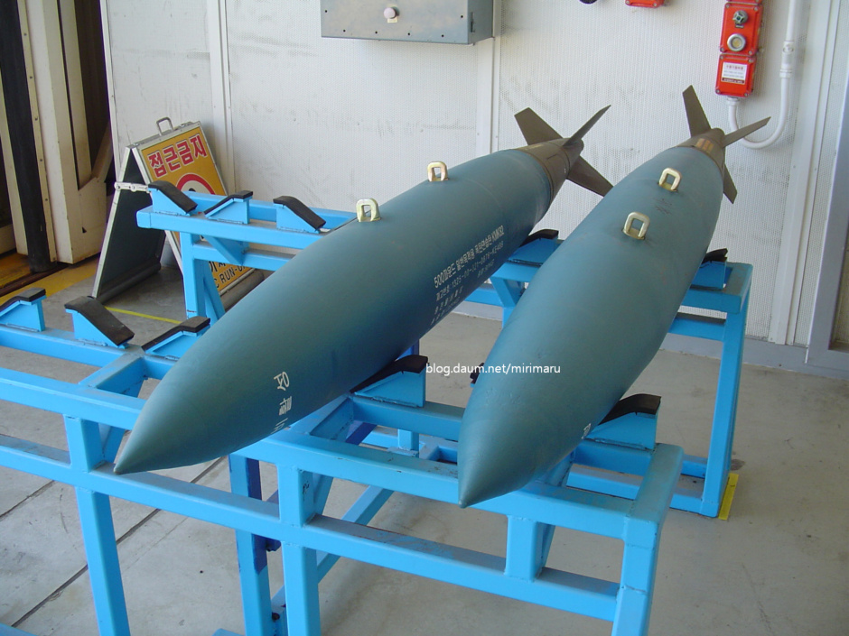 T-50에 탑재되는 500파운드짜리 MK82 폭탄입니다. 훈련탄이기 때문에 청색으로 칠해져 있습니다. T-50 훈련기가 공격형 A-50으로 개발될 경우 골든이글에 탑재된 모습을 자주 보실 수 있을 겁니다.